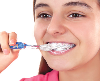 You should brush with a fluoride toothpaste at least two times per day (preferably after meals), for at least two minutes each time. Remember to brush all of the tooth surfaces: the outside, the inside, and the chewing surfaces as well. Be especially careful to clean the areas between wires and teeth, and between brackets and gums — that's where food particles can easily become trapped.